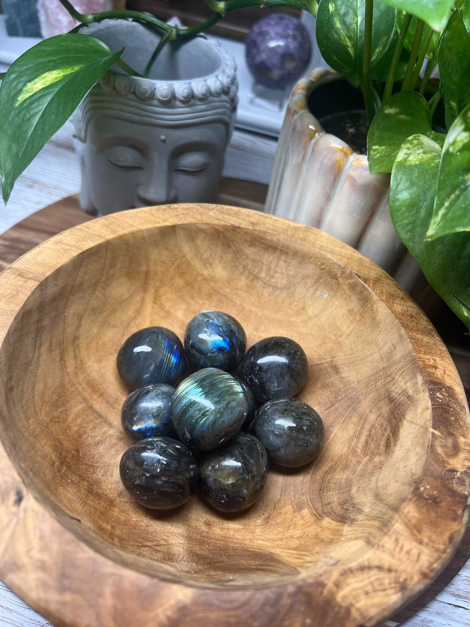 LABRADORIT: Kristallen sägs lägga en grund för andligt uppvaknande.Sägs vara en magisk sten som skyddar auran, tar bort oönskade energier och energiläckage och stärker  intuitionen och självförtroendet. Den förstärker ens andliga gåvor, telepati och förmågan att förutse händelser. Förstärker även ens helande egenskaper och välbefinnande. En bra sten för den som är blyg och inte vågar ta för sig. Den låter en se möjligheterna och fånga dem. Stenen har oftast ett skimmer som påminner om norrsken. Främjar fysisk och psykisk hälsa genom att stärka immunförsvaret och ger upplyftande och inspirerande energier.