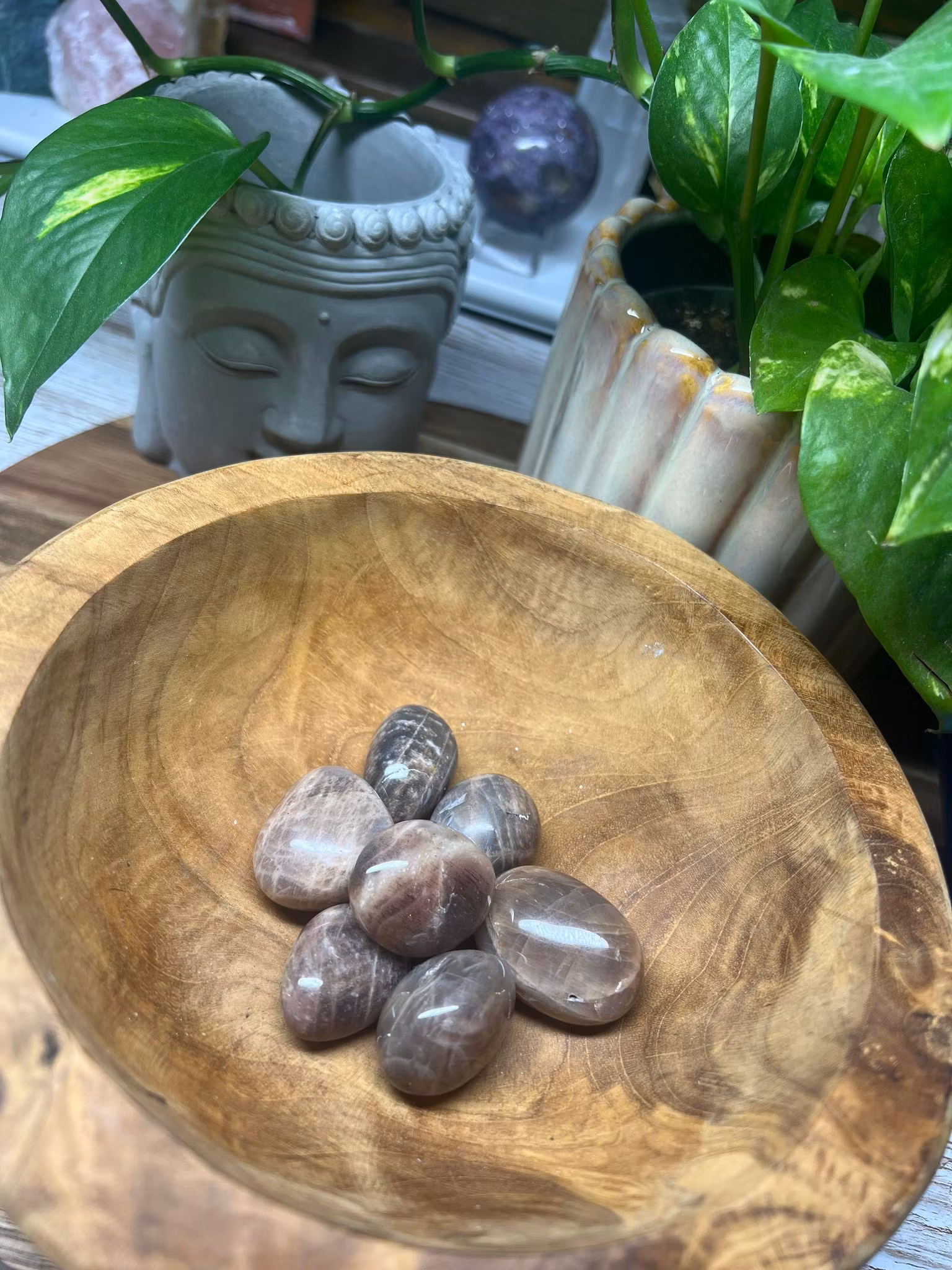 SVART MÅNSTEN: Sägs hjälpa en att acceptera nuet, livsresan man är på och styra vart man är på väg. En beskyddande sten för auran och som omvandlar negativ energi till positiv energi. Nymåne Kristall för nystart och förändring. Används för att föra in nyskapande och förnyande energier i våra liv. Den ökar kontakten till det Gudomliga och mediala förmågor samt underlättar vägledning från högre energier och civilisationer. En femenin kristall, kroppens yin energi som balanserar kvinnliga hormoner och lindrar problem så som mensvärk. Stärker även naturlig befruktning för kvinnor som försöker bli gravida. Den hjälper en att manifestera och förverkliga drömmar och mål. Drar till sig överflöd och stabiliserar ekonomin.